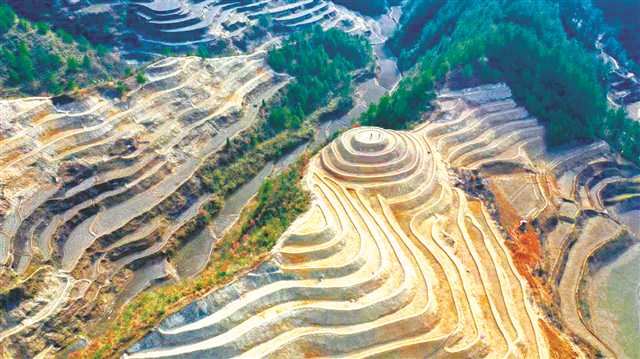 為開發(fā)利用土地資源,入冬以來,酉陽縣將何家?guī)r村5817畝荒山荒坡和撂荒地全部改造成為高產(chǎn)優(yōu)質(zhì)梯田,用來發(fā)展生態(tài)有機“花田貢米”,并打造360度高山梯田景觀。目前改造工程基本完工,即將進入引排水溝渠、耕種便道施工階段。