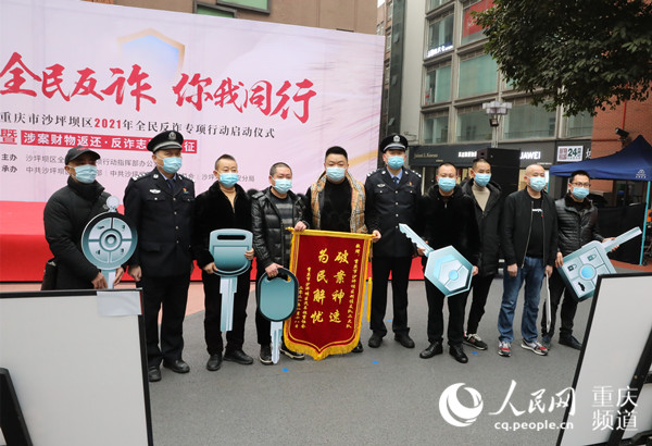 人民網(wǎng)重慶1月20日電(劉政寧)20日上午,由重慶市沙坪壩區(qū)全民反詐專項(xiàng)行動(dòng)指揮部辦公室主辦,沙坪壩區(qū)委宣傳部、區(qū)委政法委、區(qū)公安分局承辦的“全民反詐 你我同行”2021年全民反詐行動(dòng)啟動(dòng)儀式暨涉案財(cái)物返還·反詐志愿者出征活動(dòng)在三峽廣場(chǎng)舉行。