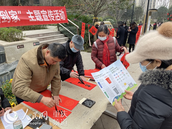 愛好書法的小區(qū)業(yè)主正在為居民寫春聯(lián)。 人民網(wǎng) 胡虹攝