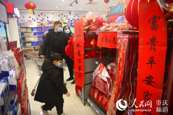周秀一家在超市選購(gòu)春聯(lián)。 人民網(wǎng) 劉政寧攝