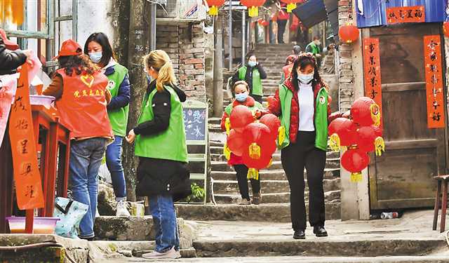 南岸區(qū)銅元局街道雙峰山社區(qū)的志愿者正在為居民樓懸掛紅燈籠。通訊員 郭旭 攝/視覺重慶