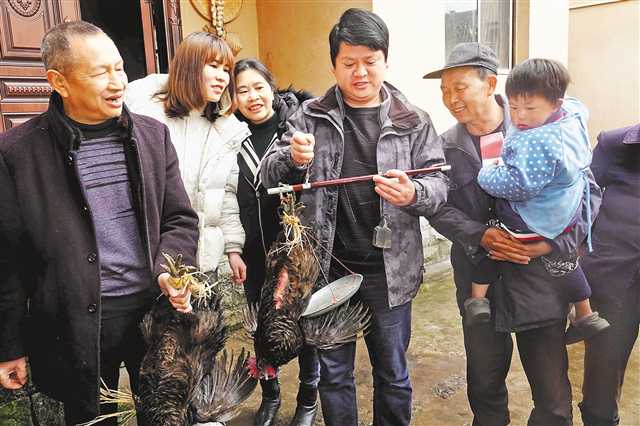 2月18日,節(jié)后上班第一天,萬盛經(jīng)開區(qū)萬東鎮(zhèn)五和村駐村第一書記謝豪 (左四)正在為村民銷售農(nóng)家土雞。特約攝影 曹永龍/視覺重慶