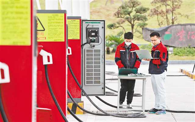 2月18日,在璧山高新區(qū),重慶高新技術(shù)產(chǎn)業(yè)研究院的科技人員在調(diào)試新型碳化硅半導(dǎo)體充電樁。特約攝影 謝捷/視覺重慶