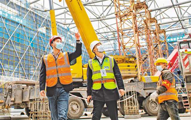2月18日,在禮嘉智慧公園智慧館項(xiàng)目工地上,兩江產(chǎn)業(yè)集團(tuán)禮嘉工程中心主任趙斌(左)正在檢查智慧館屋頂安裝推進(jìn)情況。春節(jié)期間,智慧館建設(shè)加班加點(diǎn)干,確保了項(xiàng)目進(jìn)度。整個(gè)項(xiàng)目預(yù)計(jì)今年7月底完工。記者 張錦輝 攝/視覺重慶