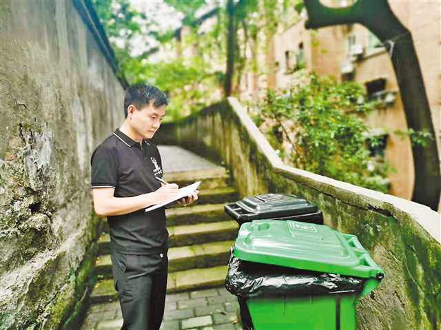 王迪在社區(qū)檢查垃圾分類情況。記者 張莎 攝\視覺重慶