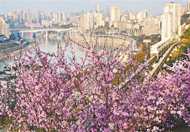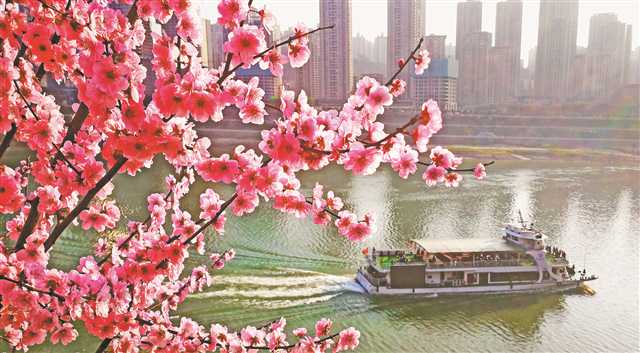 二月十九日,北濱路,美人梅迎風(fēng)綻放,載著乘客的輪船仿佛在畫中游。特約攝影 鐘志兵\視覺重慶