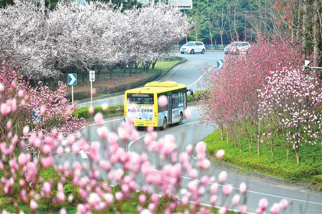 3月1日,江津長(zhǎng)江公路大橋南橋頭立交繁花盛開,春意盎然。