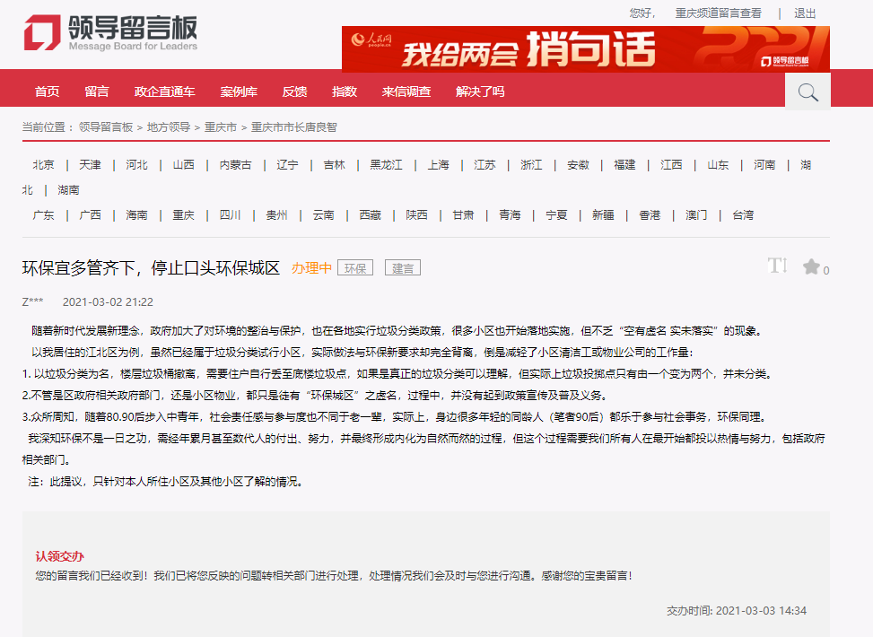 江北網(wǎng)友給市長留言:垃圾分類不要“空有虛名實(shí)未落實(shí)”