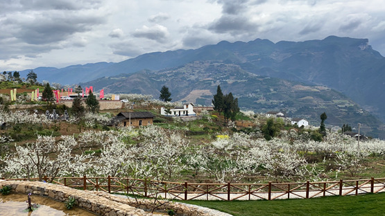 面朝壯闊的山河與云雨,近處是大片李花園。當(dāng)日,位于曲尺鄉(xiāng)權(quán)發(fā)村樵灘坪脆李園的三峽李院正式開(kāi)門(mén)迎客。
