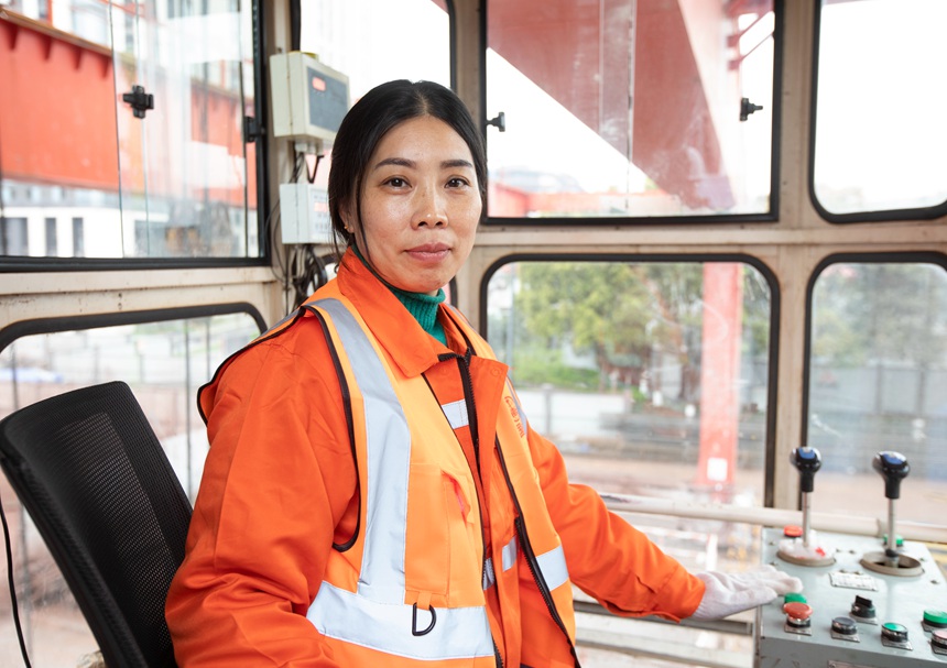 “我有好多女同學(xué)都在當(dāng)?shù)踯囻{駛員!比~義瓊說,“有不少人問我,為啥這么多女工開吊車,我想,可能是因為細(xì)心吧!泵刻煸缟6點,葉義瓊就要起床了,7點鐘到工地。爬上高高的“龍門吊”,小小的駕駛艙不足2平方米,一待就是十來個小時,除了上廁所不會下來。