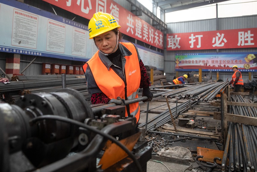 在重慶軌道4號線二期土建三標(biāo)鋼筋加工廠,現(xiàn)場火花四濺,一派繁忙,幾名女工忙碌的身影卻格外顯眼。她們就是來自中鐵八局的鋼筋加工娘子軍,也是工友們口中的“鋼花”。