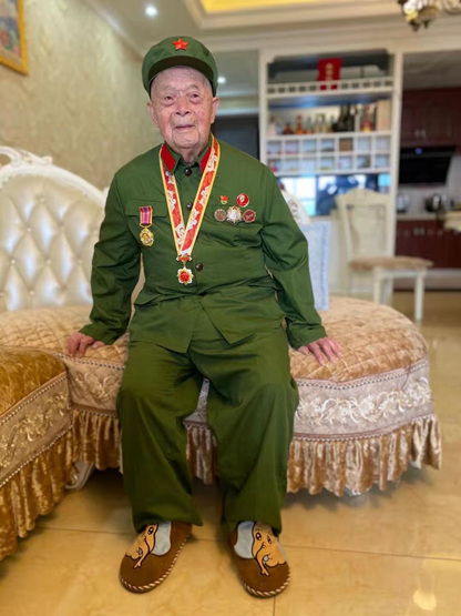 由于疾病困擾,如今93歲高齡的蔣誠已經不大回憶得起往事了。穿著一身樸素的綠色軍裝,胸前的軍功章依舊閃亮,他走路不大利索,需要家人攙扶。多數時候,他連親人的名字都叫不出來。但是,頭腦清醒的時候,他卻唱得出那首上戰(zhàn)場時唱的軍歌--“雄赳赳,氣昂昂,跨過鴨綠江……”