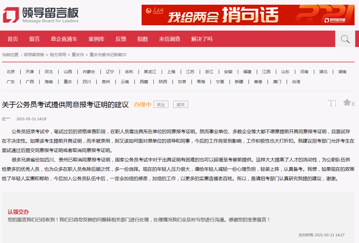 人民網(wǎng)重慶3月12日電(陳琦)“建議招考部門(mén)允許考生在面試通過(guò)后,再提交所在單位同意報(bào)考證明或者取消同意報(bào)考證明。”3月11日,有網(wǎng)友通過(guò)人民網(wǎng)《領(lǐng)導(dǎo)留言板》給重慶市委書(shū)記陳敏爾建議。