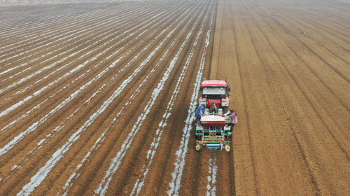3月11日,河北省唐山市豐南區(qū)小集鎮(zhèn)起莊子村的農(nóng)民在使用機(jī)械設(shè)備播種馬鈴薯(無(wú)人機(jī)照片)。