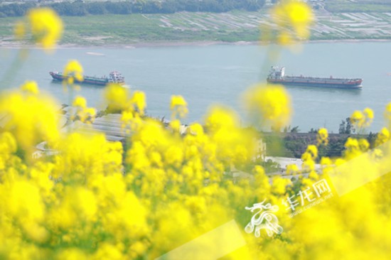 油菜花開與遠(yuǎn)處江上航船相互輝映。