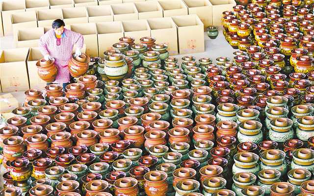 3月17日,梁平工業(yè)園區(qū)的重慶天戈陶瓷有限公司,工人將生產(chǎn)的泡菜壇裝箱。