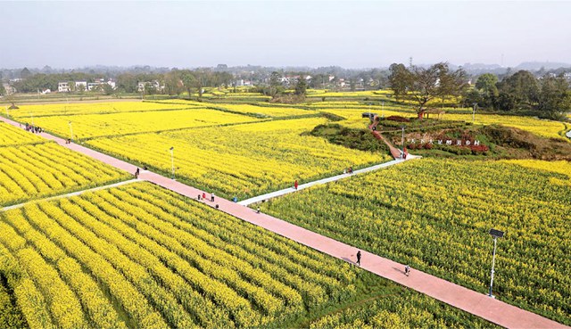 昨日,拾萬鎮(zhèn)長虹村千畝硒鍶油菜苔基地里,盛放的油菜花猶如一片金色的海洋,為美麗鄉(xiāng)村添色彩、增詩意,吸引了不少游客在這里游玩、采風。該基地采用優(yōu)質稻油菜輪作模式,前一年統(tǒng)一旋耕、開溝、播種,3月賞花,6月收油菜籽,接著輪作晚稻,平均畝產油菜苔150公斤、油菜籽100公斤,畝均增收600元。