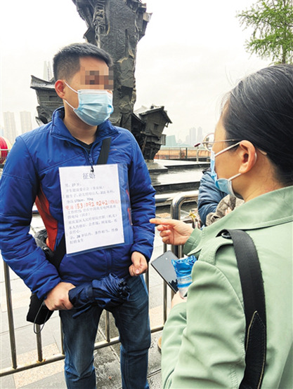 小陳穿著一身藍色羽絨服,雖然戴著口罩,但眼神里卻透著一股精神勁兒。他胸前掛了一張打印的自我介紹:男,27歲,衛(wèi)生健康委員會(事業(yè)編),獨生子,渝北區(qū)人,211本科,身高173,70公斤,工作經(jīng)歷:……本人性格好,會煮飯,顧家庭,有責任心。尋:28歲以內(nèi),條件相當,性格好的女生。電話……