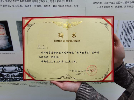 雙龍湖街道黨工委頒發(fā)給李可的宣講員聘書
