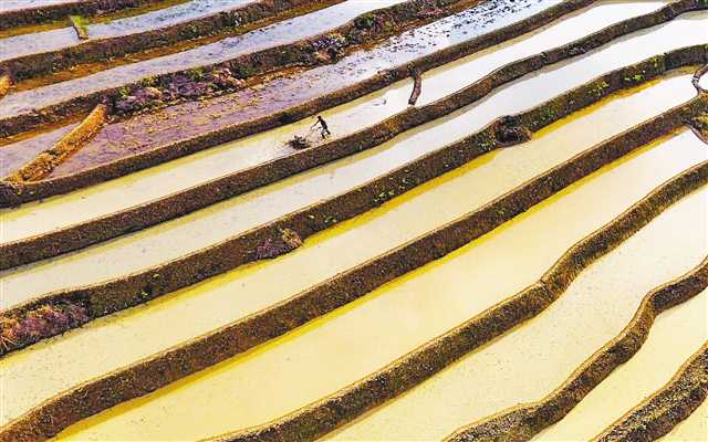 萬盛經開區(qū)石林鎮(zhèn)的梯田鱗次櫛比,在陽光的照耀下閃著金色的光芒。3月19日一大早,當?shù)卮迕窬驮谟梦⒏麢C整田,準備播種早稻。近年來,當?shù)剞r業(yè)部門針對山區(qū)耕地地塊小、坡度大的實際,大力推廣微耕機耕作,讓微耕機成為春耕春播好“幫手”。一村民說:“使用微耕機整田,簡單好操作,比用耕?於嗔。”