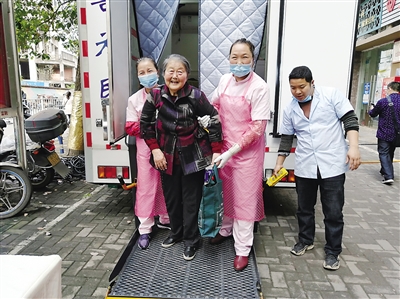 17日下午,一輛“重慶市慈善總會(huì)助浴快車(chē)”停在九龍坡區(qū)石橋鋪街道柏林社區(qū)養(yǎng)老服務(wù)站,家住慧藍(lán)御錦小區(qū)的劉敏華老人在測(cè)量體溫和血壓后,在助浴師馮地華和其搭檔陳大姐的攙扶下,進(jìn)入“助浴快車(chē)”沐浴。