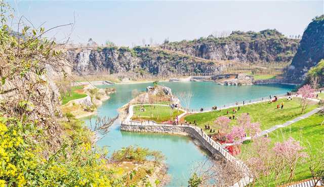 3月28日,銅鑼山礦山公園,峭壁懸崖下,清澈的湖水湛藍動人,寬敞的草坪上盛開著鮮花,吸引了眾多游客前往游玩。通過綜合治理+生態(tài)修復(fù),位于渝北區(qū)石船鎮(zhèn)的銅鑼山礦山公園于今年年初公益性開園。
