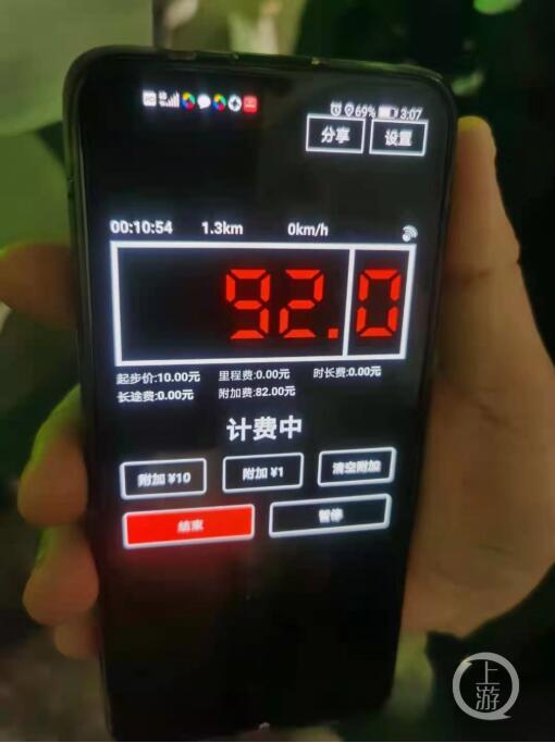 執(zhí)法人員告訴記者,他們現(xiàn)場檢查發(fā)現(xiàn):駕駛員唐某所謂的計(jì)價(jià)器是他手機(jī)上安裝的一個(gè)軟件,從乘客上車到車輛被查,不到20分鐘的時(shí)間,該軟件顯示費(fèi)用為92元。