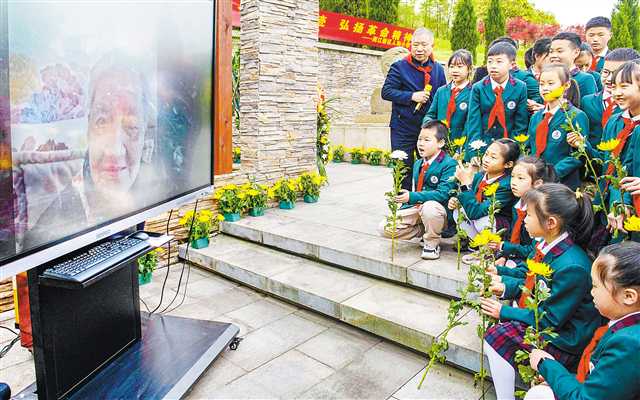 4月3日,在唐虛谷、楊袁善烈士陵園內(nèi),唐虛谷烈士的遺孀楊哲卿通過(guò)視頻勉勵(lì)同學(xué)。記者 張錦輝 攝/視覺(jué)重慶