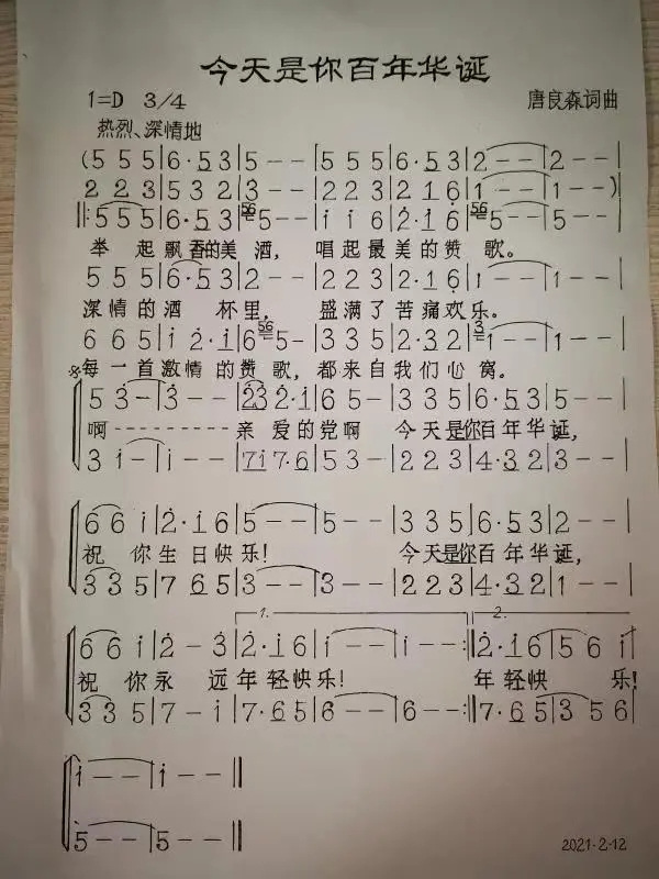 今年是中國(guó)共產(chǎn)黨成立100周年。元旦過(guò)后的閑暇之余,武陵路社區(qū)老黨員唐良森便萌發(fā)了創(chuàng)作念頭,他想通過(guò)才藝展示的方式來(lái)為黨慶生,于是創(chuàng)作了歌曲《今天是你百年華誕》。