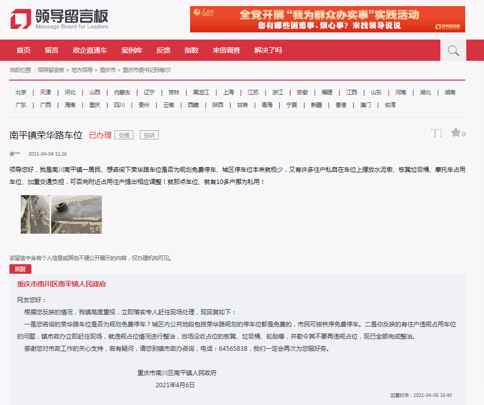 針對(duì)留言,南川區(qū)南平鎮(zhèn)政府回復(fù)稱:榮華路段屬于城區(qū)公共地段,市民可按秩序免費(fèi)停車。對(duì)于有住戶違規(guī)占用車位的問題,南平鎮(zhèn)市政辦現(xiàn)場(chǎng)對(duì)違規(guī)占位情況進(jìn)行了整治,當(dāng)場(chǎng)沒收占位的私人物品,并勒令其不再違規(guī)占位。
