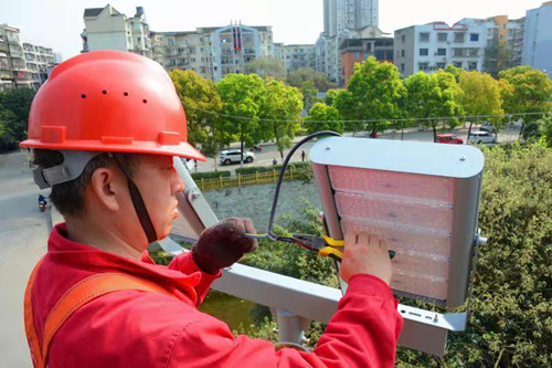 工作人員安裝路燈消除照明盲區(qū)。永川區(qū)城管局供圖