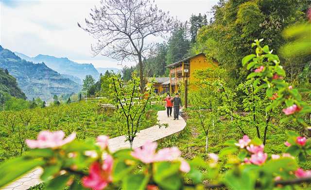 沿著一片粉色木瓜花海一路往下,就到了老黨員馬培清家。如今,馬家院壩成了游客“打卡”的地方,不少游客正在小樓前拍照留念。小樓一側(cè),由馬家舊豬圈改成的中華主題郵局里增加了土特產(chǎn)品和飲料,閑置的閣樓改造成“初心書屋”,供游客休閑閱讀。馬培清的兒媳婦譚明蘭兼售貨員、書屋管理員,還在非遺扶貧就業(yè)工坊做手工,忙得團團轉(zhuǎn)。