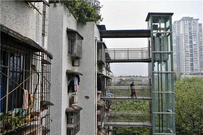 南岸區(qū)海棠溪街道,社區(qū)居民乘坐新安裝的電梯上下樓。郭旭 攝