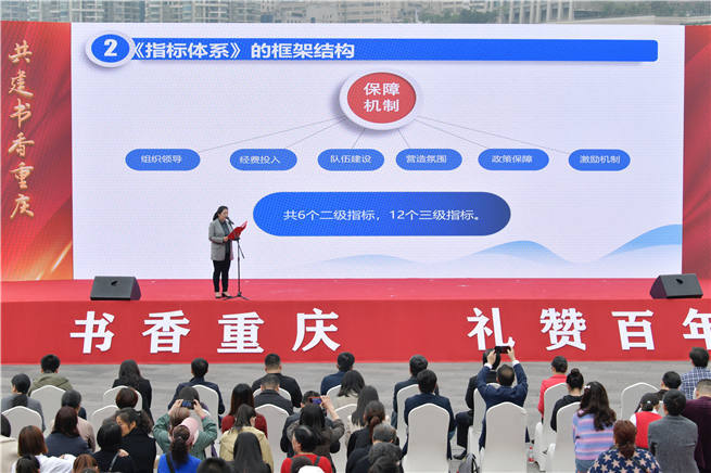 在今日的啟動(dòng)儀式上,還發(fā)布了重慶市全名閱讀評(píng)價(jià)指數(shù)體系,該體系確定了閱讀設(shè)施、閱讀資源、閱讀服務(wù)、閱讀活動(dòng)、閱讀水平和保障機(jī)制等6個(gè)版塊,旨在以評(píng)促建,統(tǒng)籌推進(jìn)書香重慶建設(shè)。