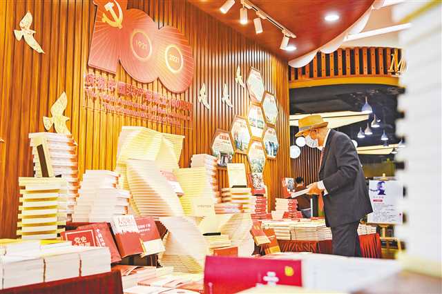 4月22日,渝中區(qū)新華書店,市民正在選購書籍。書店內(nèi)在顯要位置設(shè)立了慶祝中國共產(chǎn)黨成立100周年黨史學習教育重點讀物展示臺。