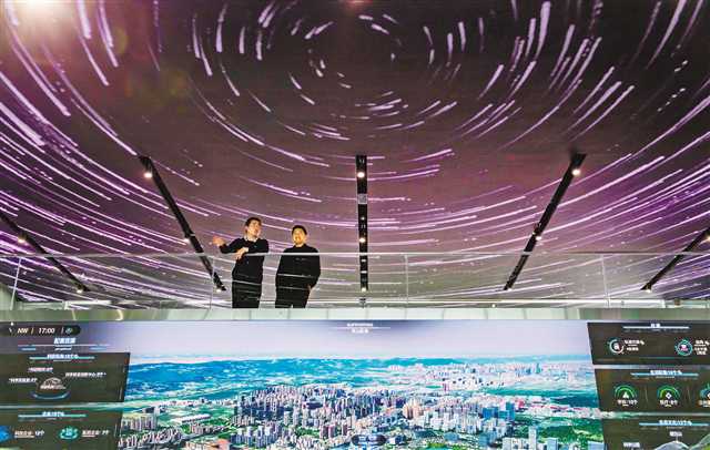4月20日,在西部(重慶)科學(xué)城AI PARK展廳,呈現(xiàn)星光的頂部設(shè)計和顯示屏充滿科技感。