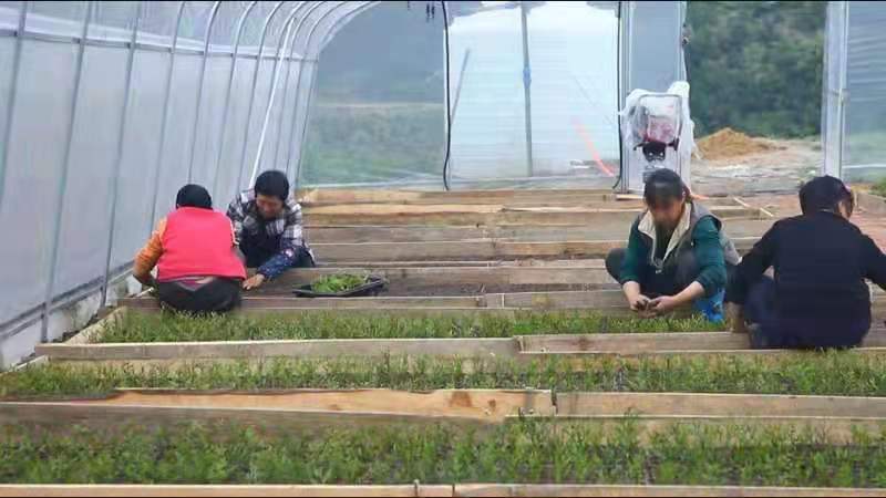 工人將崖柏枝條移入大棚培育。賀寶攝