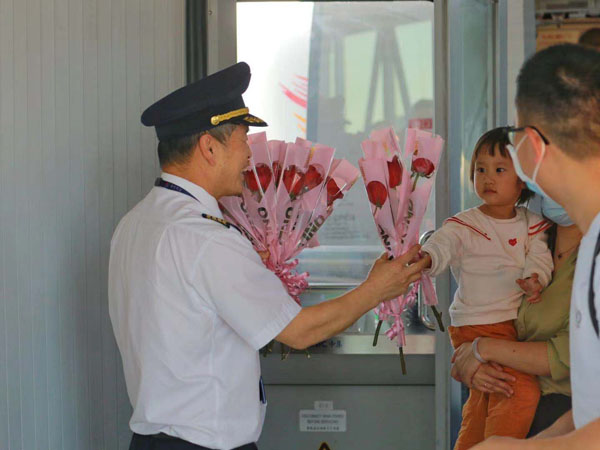 飛機(jī)平穩(wěn)降落重慶機(jī)場(chǎng)后,李晶走出駕駛艙,站在艙門(mén)前與旅客握手告別,機(jī)組成員和旅客們把寫(xiě)有祝福語(yǔ)的小紙條和鮮花送給李晶。