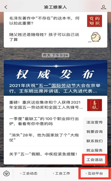 市民可關(guān)注“渝工娘家人”微信公眾號(hào),點(diǎn)擊首頁(yè)右下角“互動(dòng)平臺(tái)”進(jìn)入“工會(huì)活動(dòng)”參與活動(dòng)。重慶市總工會(huì)供圖