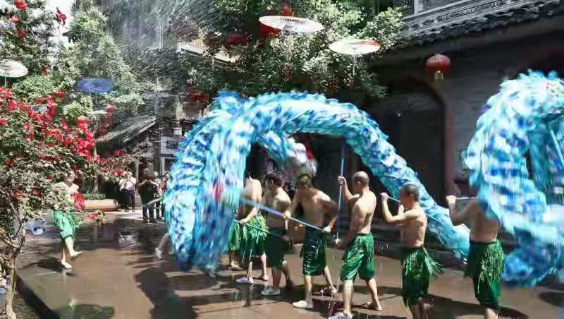在銅梁安居古城西街,一條藍(lán)色16米長(zhǎng)的藍(lán)色“水云龍”,從迎龍門(mén)呼嘯而出,在赤膊的漢子舞動(dòng)下,時(shí)緩時(shí)急上下飛舞。所到之處,游客們爭(zhēng)相用水盆向龍身潑水,參與當(dāng)?shù)鬲?dú)特的民俗文化,感受漫天水花和激烈龍舞,帶來(lái)的視覺(jué)盛宴。