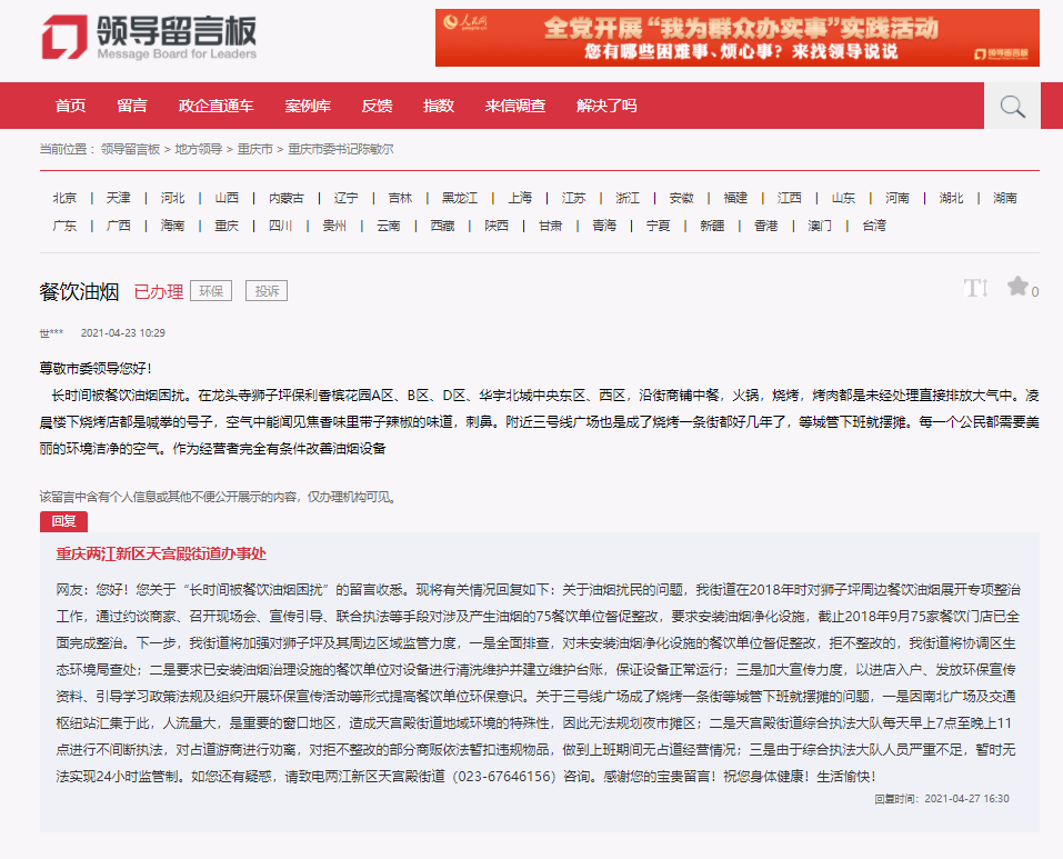 人民網(wǎng)重慶5月6日電 (陳琦)近日,有網(wǎng)友通過人民網(wǎng)《領(lǐng)導(dǎo)留言板》留言, 反映其居住的龍頭寺獅子坪保利香檳花園一帶餐飲店油煙、噪音擾民問題。對此,兩江新區(qū)天宮殿街道辦事處給予回復(fù)。具體內(nèi)容如下: