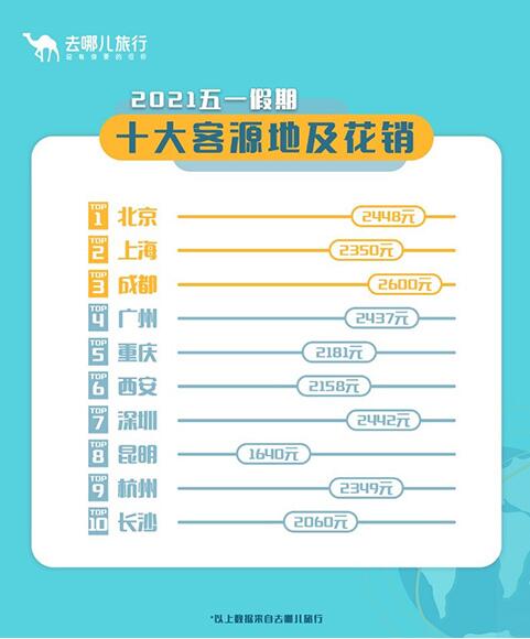 “五一”假期十大客源地及人均出游消費(fèi)。去哪兒供圖