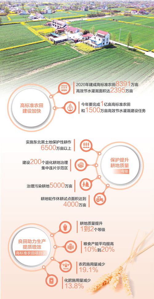 耕地是寶貴的資源。針對地塊破碎、灌排不暢、機(jī)耕道標(biāo)準(zhǔn)低等問題,農(nóng)業(yè)農(nóng)村部大力推進(jìn)高標(biāo)準(zhǔn)農(nóng)田建設(shè)。2020年中央財(cái)政農(nóng)田建設(shè)補(bǔ)助資金總額達(dá)867億元,全年建成高標(biāo)準(zhǔn)農(nóng)田8391萬畝,高效節(jié)水灌溉面積達(dá)2395萬畝。