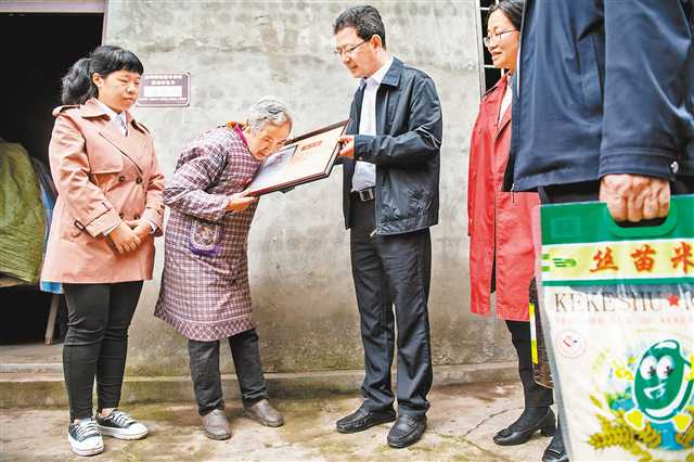 五月七日,永川區(qū)勝利路街道豐田村,區(qū)退役軍人事務(wù)局工作人員將烈士賴云清墓碑的照片送到陳學(xué)明老人(左二)手中。記者 崔力 攝\視覺(jué)重慶
