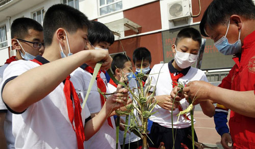 5月10日,學(xué)生們在民間藝人指導(dǎo)下體驗草編。