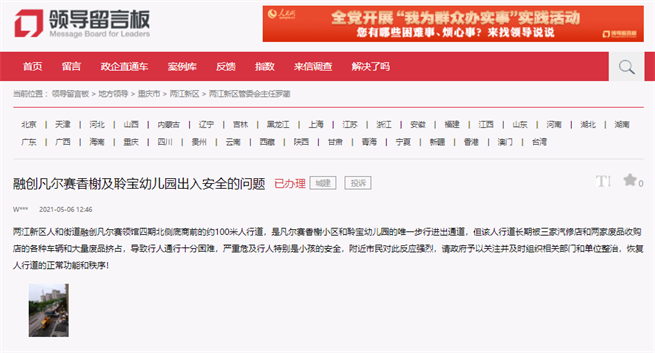 兩江新區(qū)人和街道融創(chuàng)凡爾賽領(lǐng)館四期北側(cè)底約100米人行道,是凡爾賽香榭小區(qū)和聆寶幼兒園的唯一步行進(jìn)出通道,但該人行道長期被三家汽修店和兩家廢品收購店的各種車輛和大量廢品擠占,導(dǎo)致行人通行十分困難,嚴(yán)重危及行人特別是小孩的安全,附近市民對此反應(yīng)強(qiáng)烈,請政府予以關(guān)注并及時組織相關(guān)部門和單位整治,恢復(fù)人行道的正常功能和秩序!