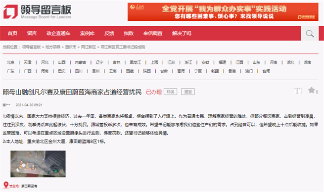 人民網(wǎng)重慶5月13日電 (陳琦)近日,有網(wǎng)友通過人民網(wǎng)《領(lǐng)導(dǎo)留言板》留言,反映其居住的兩江新區(qū)人和街道融創(chuàng)凡爾賽附近,人行道被臨街商鋪的車輛和雜物擠占,導(dǎo)致行人通行很受影響。