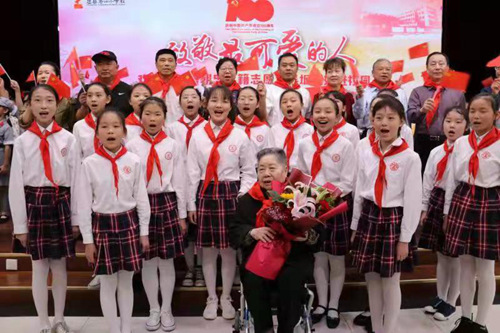 電影《上甘嶺》中女衛(wèi)生員王蘭的原型之一、88歲的忠縣籍抗美援朝老戰(zhàn)士吳炯和師生們共同唱起電影《上甘嶺》主題曲《我的祖國》。