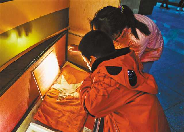 “這就是重慶升起的第一面五星紅旗,它用紅綢被面和黃紙制成。”在講解員高潔的指引下,重慶日?qǐng)?bào)記者看到一面紅旗疊放整齊,靜靜地躺在玻璃展柜中,已有些褪色,針腳也略顯粗糙。