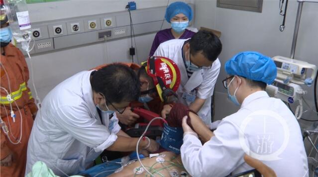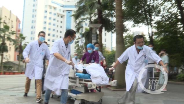 當(dāng)日16點(diǎn),護(hù)送病人的救護(hù)車一路風(fēng)馳電掣,直奔重慶主城。但高速上比較擁堵,警方了解到情況后立即派出一輛警車在前面開道。17點(diǎn)10分,終于抵達(dá)醫(yī)院急診科,早已等待多時(shí)的搶救團(tuán)隊(duì)立即將病人推到急救室,詢問觀測病情,建立靜脈通道,連接生命監(jiān)測設(shè)備。這時(shí)病人的心率開始加快,情況非常不好!氨仨汃R上作CT搞清楚傷情!”在醫(yī)生引導(dǎo)下,消防官兵小心翼翼地將體外的鋼筋鋸斷,確保能完成CT檢查。